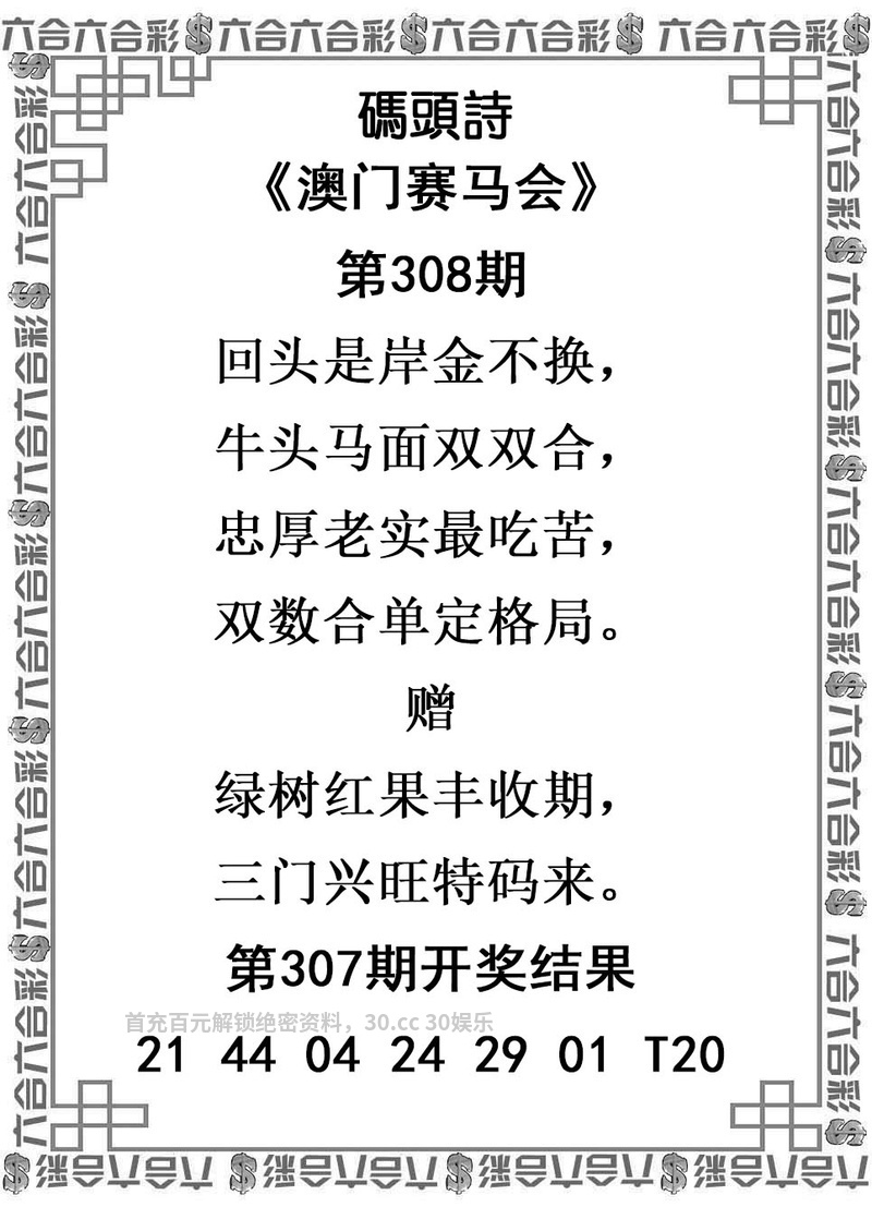 | 308期 | 马牛 | 06合 | 4头双 | 兔39 |